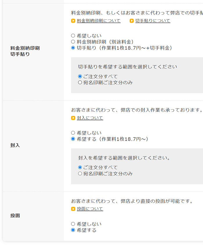 投函を希望されず、封入のみ/切手貼りのみでも承っております。(有料)